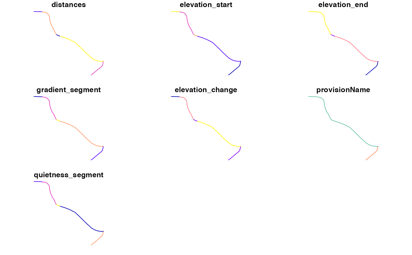 from = "Leeds Rail Station" to = "University of Leeds" # from_point = tmaptools::geocode_OSM(from) # to_point = tmaptools::geocode_OSM(to) from_point = c(-1.54408, 53.79360) to_point = c(-1.54802, 53.79618) # save result from the API call to journey.json # res_json = journey(from_point, to_point, silent = FALSE, save_raw = TRUE) # jsonlite::write_json(res_json, "inst/extdata/journey.json") f = system.file(package = "cyclestreets", "extdata/journey.json") obj = jsonlite::read_json(f, simplifyVector = TRUE) rsf = json2sf_cs(obj, cols = c("distances")) names(rsf)#> [1] "distances" "elevation_start" "elevation_end" #> [4] "gradient_segment" "elevation_change" "provisionName" #> [7] "quietness_segment" "geometry"rsf#> Simple feature collection with 5 features and 7 fields #> Geometry type: LINESTRING #> Dimension: XY #> Bounding box: xmin: -1.54802 ymin: 53.7936 xmax: -1.54324 ymax: 53.79618 #> Geodetic CRS: WGS 84 #> distances elevation_start elevation_end gradient_segment elevation_change #> 1 87 27 28 0.01149425 1 #> 2 234 28 33 0.02564103 6 #> 3 18 33 32 0.05555556 1 #> 4 131 32 34 0.01526718 2 #> 5 36 34 34 0.00000000 0 #> provisionName quietness_segment geometry #> 1 Unclassified road 0.2478632 LINESTRING (-1.54408 53.793... #> 2 Main road 0.1800000 LINESTRING (-1.54324 53.794... #> 3 Main road 0.5294118 LINESTRING (-1.54624 53.795... #> 4 Main road 0.2330961 LINESTRING (-1.54649 53.795... #> 5 Main road 0.2000000 LINESTRING (-1.54747 53.796...#> [1] "time" "busynance" "signalledJunctions" #> [4] "signalledCrossings" "name" "walk" #> [7] "elevations" "distances" "elevation_mean" #> [10] "elevation_start" "elevation_end" "elevation_max" #> [13] "elevation_min" "gradient_mean" "gradient_median" #> [16] "gradient_p75" "gradient_max" "gradient_segment" #> [19] "elevation_change" "provisionName" "quietness_segment" #> [22] "start" "finish" "startSpeed" #> [25] "start_longitude" "start_latitude" "finish_longitude" #> [28] "finish_latitude" "crow_fly_distance" "event" #> [31] "whence" "speed" "itinerary" #> [34] "clientRouteId" "plan" "note" #> [37] "length" "quietness" "west" #> [40] "south" "east" "north" #> [43] "leaving" "arriving" "grammesCO2saved" #> [46] "calories" "edition" "flow" #> [49] "geometry"#> Simple feature collection with 5 features and 9 fields #> Geometry type: LINESTRING #> Dimension: XY #> Bounding box: xmin: -1.54802 ymin: 53.7936 xmax: -1.54324 ymax: 53.79618 #> Geodetic CRS: WGS 84 #> time busynance elevations elevation_start elevation_end gradient_segment #> 1 24 351 NA 27 28 0.01149425 #> 2 105 1300 NA 28 33 0.02564103 #> 3 5 34 NA 33 32 0.05555556 #> 4 48 562 NA 32 34 0.01526718 #> 5 9 180 NA 34 34 0.00000000 #> elevation_change provisionName quietness_segment #> 1 1 Unclassified road 0.2478632 #> 2 6 Main road 0.1800000 #> 3 1 Main road 0.5294118 #> 4 2 Main road 0.2330961 #> 5 0 Main road 0.2000000 #> geometry #> 1 LINESTRING (-1.54408 53.793... #> 2 LINESTRING (-1.54324 53.794... #> 3 LINESTRING (-1.54624 53.795... #> 4 LINESTRING (-1.54649 53.795... #> 5 LINESTRING (-1.54747 53.796...json2sf_cs(obj, cols = c("distances"), smooth_gradient = TRUE, gradient_cutoff = 0.05, distance_cutoff = 50)#>#> Simple feature collection with 5 features and 8 fields #> Geometry type: LINESTRING #> Dimension: XY #> Bounding box: xmin: -1.54802 ymin: 53.7936 xmax: -1.54324 ymax: 53.79618 #> Geodetic CRS: WGS 84 #> distances elevation_start elevation_end gradient_segment elevation_change #> 1 87 27 28 0.01149425 1 #> 2 234 28 33 0.02564103 6 #> 3 18 33 32 0.05555556 1 #> 4 131 32 34 0.01526718 2 #> 5 36 34 34 0.00000000 0 #> provisionName quietness_segment geometry #> 1 Unclassified road 0.2478632 LINESTRING (-1.54408 53.793... #> 2 Main road 0.1800000 LINESTRING (-1.54324 53.794... #> 3 Main road 0.5294118 LINESTRING (-1.54624 53.795... #> 4 Main road 0.2330961 LINESTRING (-1.54649 53.795... #> 5 Main road 0.2000000 LINESTRING (-1.54747 53.796... #> gradient_smooth #> 1 0.01149425 #> 2 0.02564103 #> 3 0.02349869 #> 4 0.01526718 #> 5 0.00000000